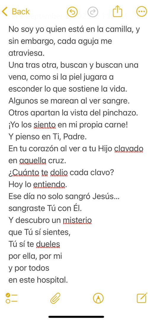 De la misma forma cuando estás en un hospital oras con mayor empatía por aquellos que están viviendo procesos similares y aunque quizás no todos están recibiendo hoy sanidad, muchas veces la mayor sanidad es entender que a Dios si le duele. Por esa razón entregó a su hijo para que todo aquel que crea en él no se pierda más tenga vida eterna… Lo entiendes él le puso fin al sufrimiento humano, del otro lado de la eternidad no tendremos más pinchazos. ¡Esa es nuestra final y más segura esperanza!